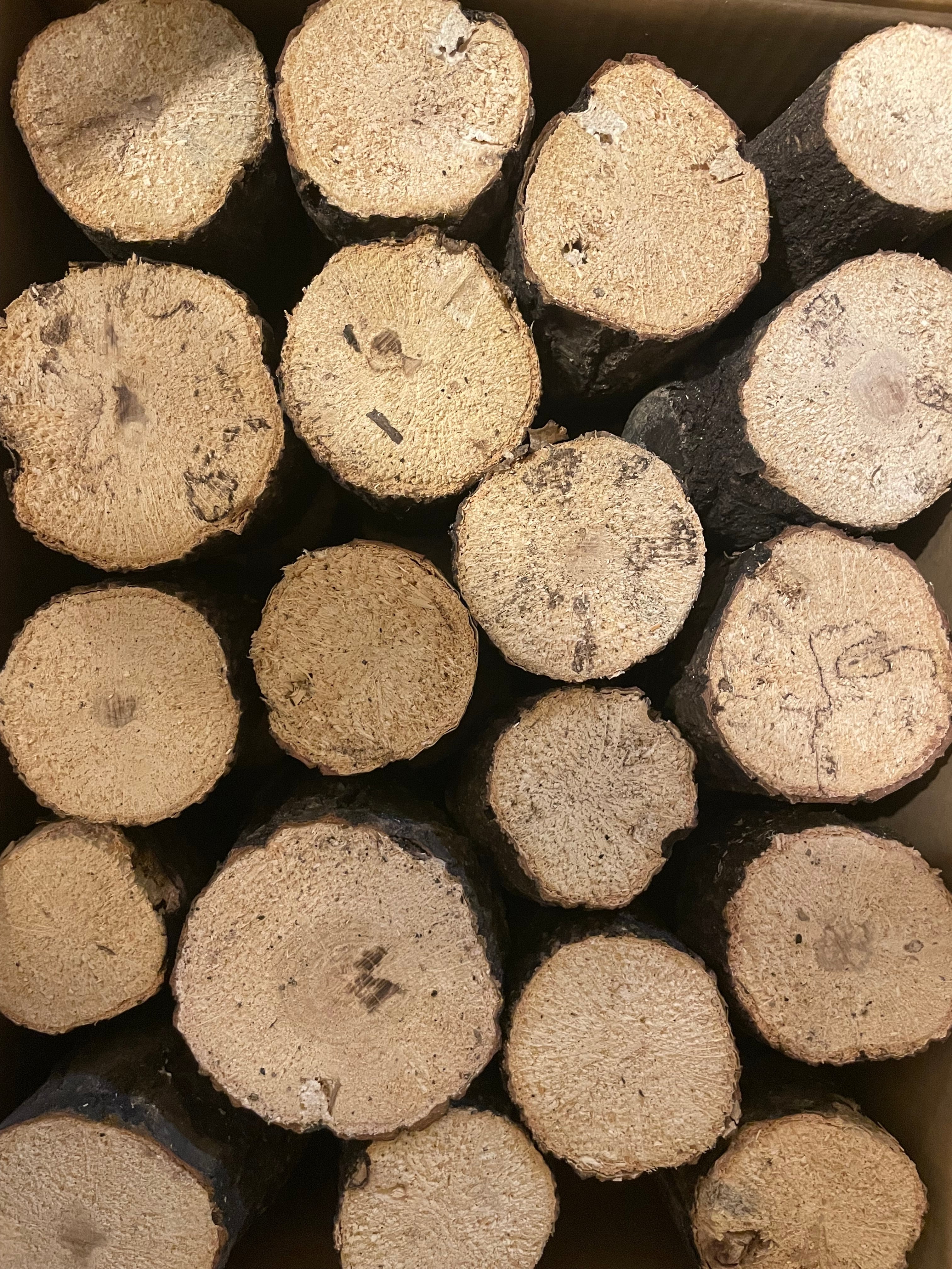 3年間熟成されたナラ材の産卵木です。椎茸原木として育てられた高品質なナラ材を使用しており、産卵にも最適な硬さを持ち合わせています。