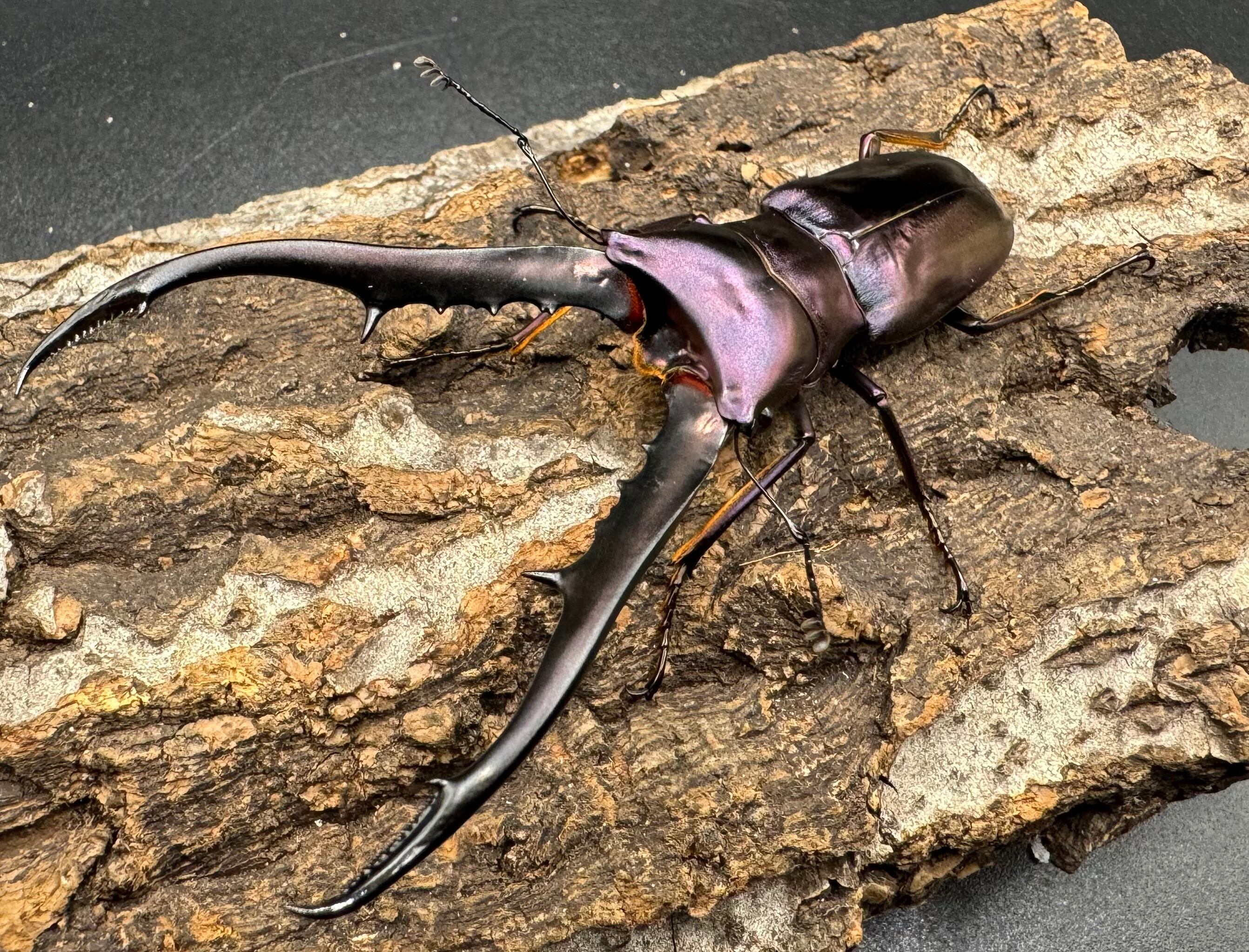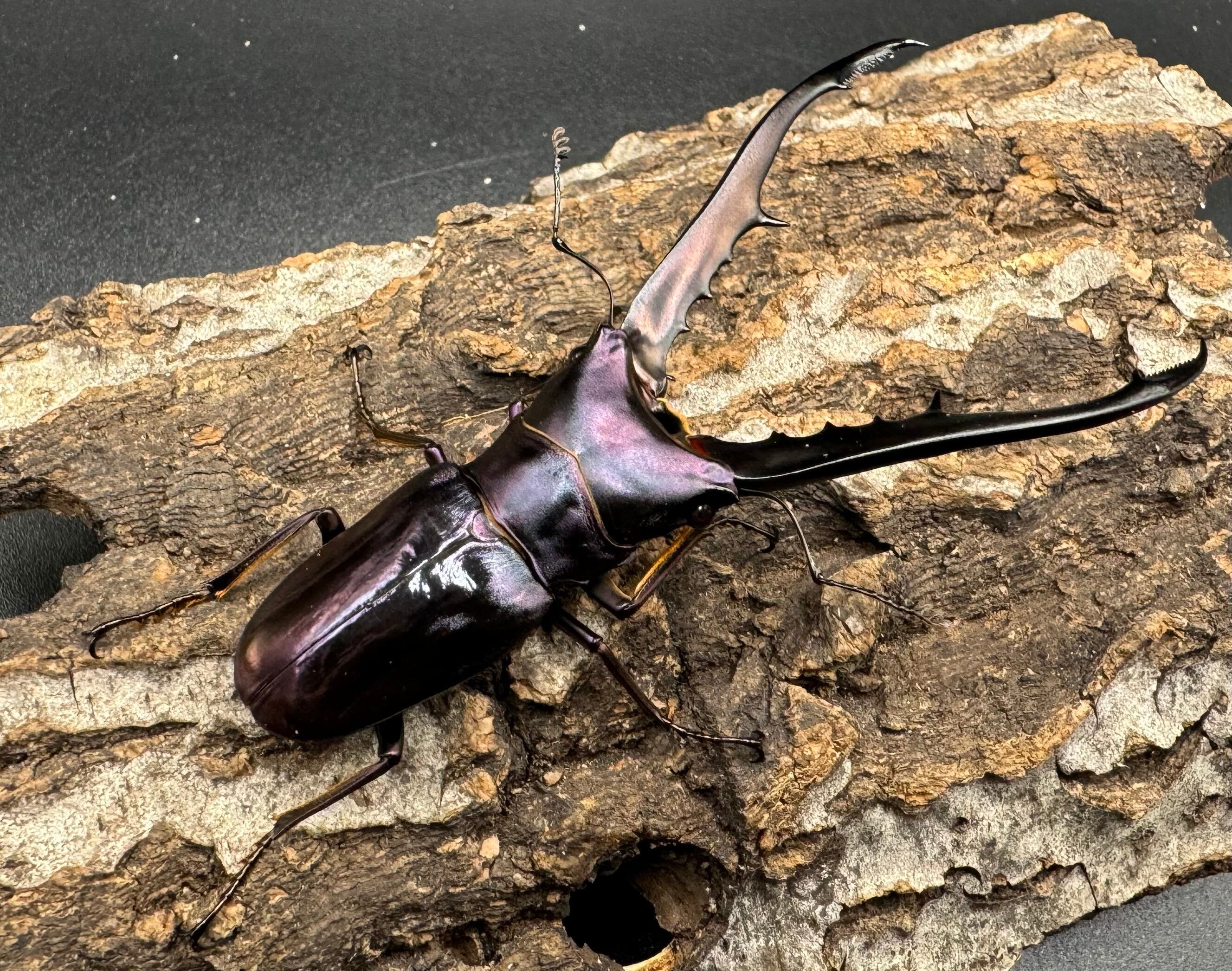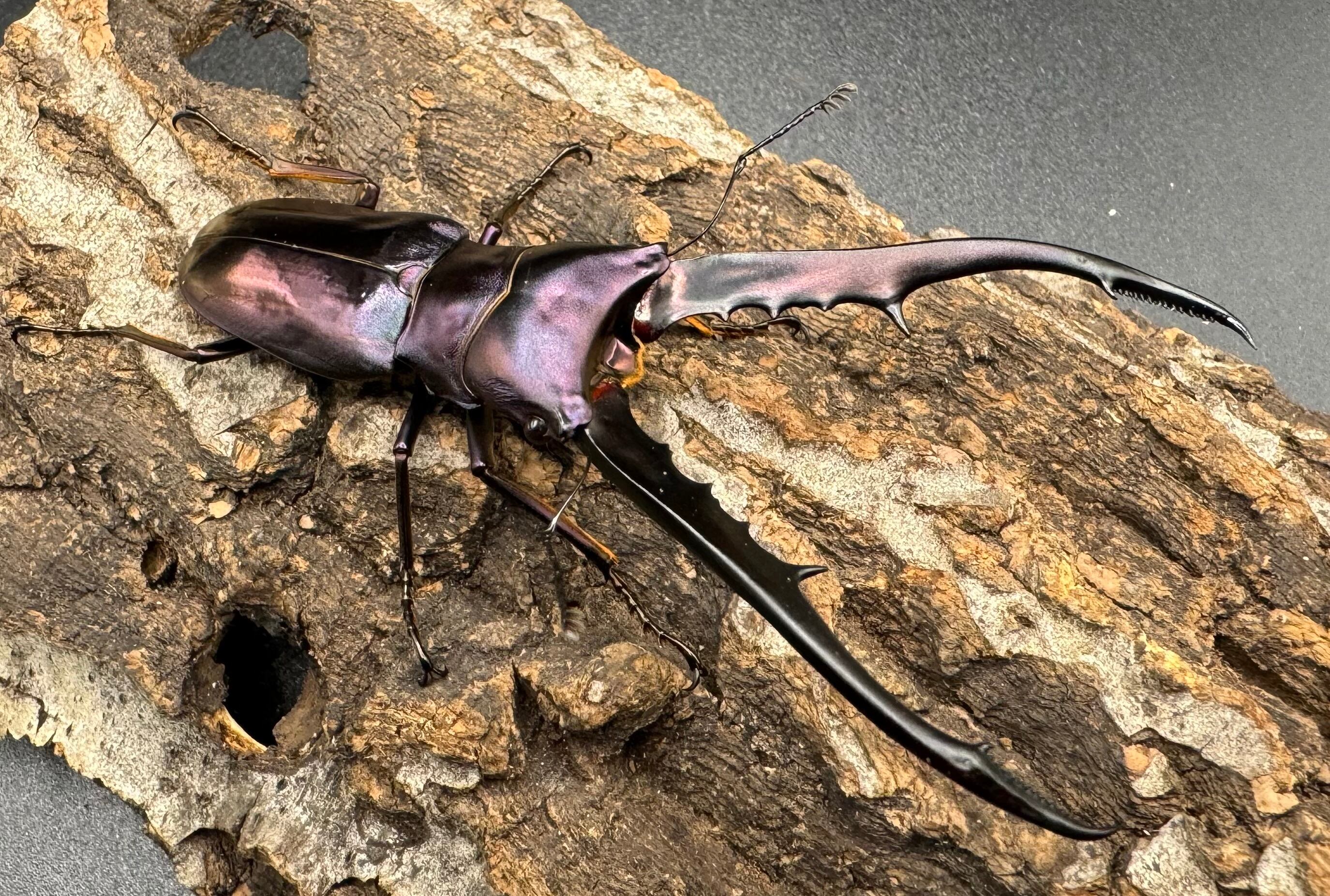 メタリは胴体よりも長い大アゴと、メタリックカラーが美しく大変人気のクワガタです。