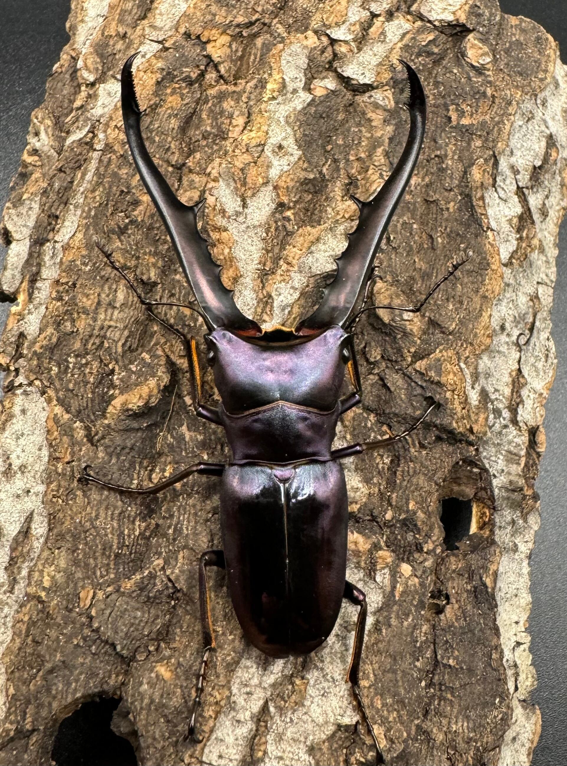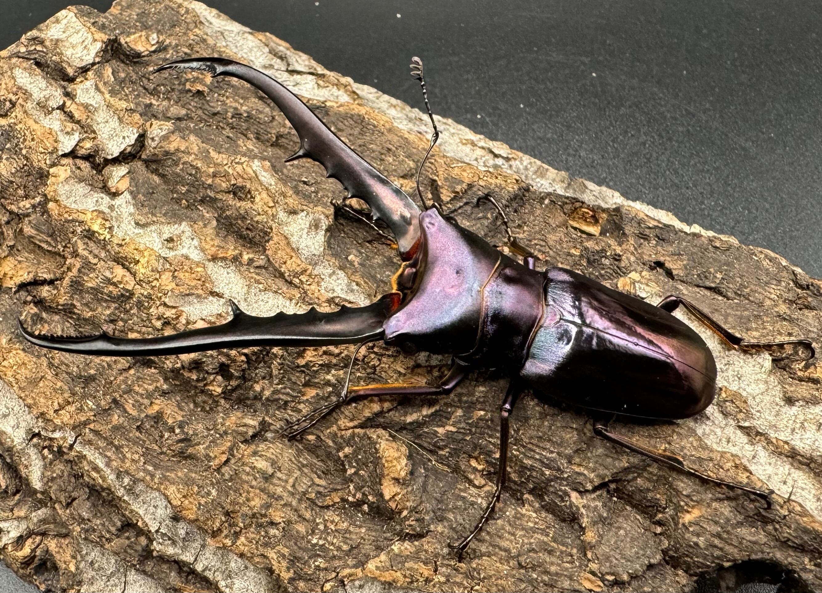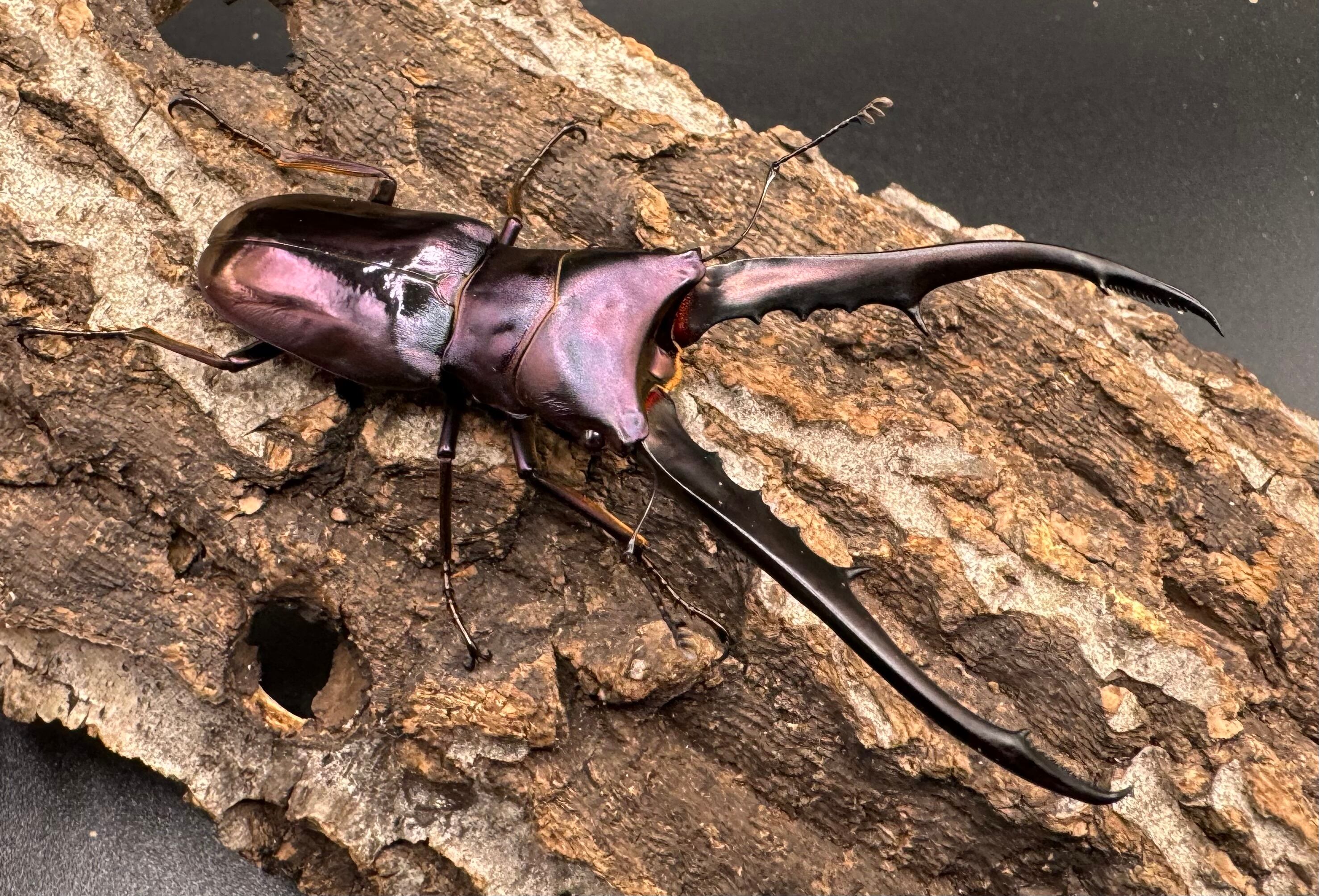 メタリは胴体よりも長い大アゴと、メタリックカラーが美しく大変人気のクワガタです。